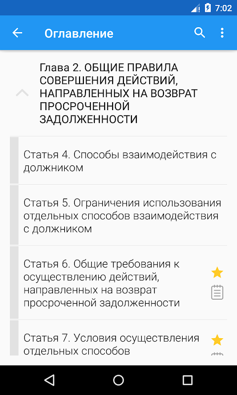 Приложение представляет собой удобный справочник по Федеральному закону РФ «О защите прав и законных интересов физических лиц при осуществлении деятельности по возврату просроченной задолженности и о внесении изменений в Федеральный закон «О микрофинансовой деятельности и микрофинансовых организациях» или же проще - закон о коллекторах. Приложение содержит полный текст закона, актуальный на данный момент времени (с изменениями от 03.07.2016).