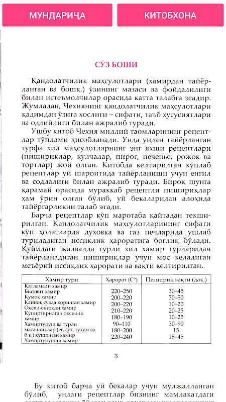 Barcha recptlar kўp marotaba kaitadan teksirilgan. Олandolatchilik masulotlarining sifati kўp атolatlarda forno va gas pechlarida ushlab turiladigan Issiқlik ҳaroratiga boғliқ bўladi. Kuyidagi jadwald turli heal hamir turlaridan tayerlanadigan pishirılar uchun mos keladigan meyorii issiқlik қarorati vaқti keltirilgan.