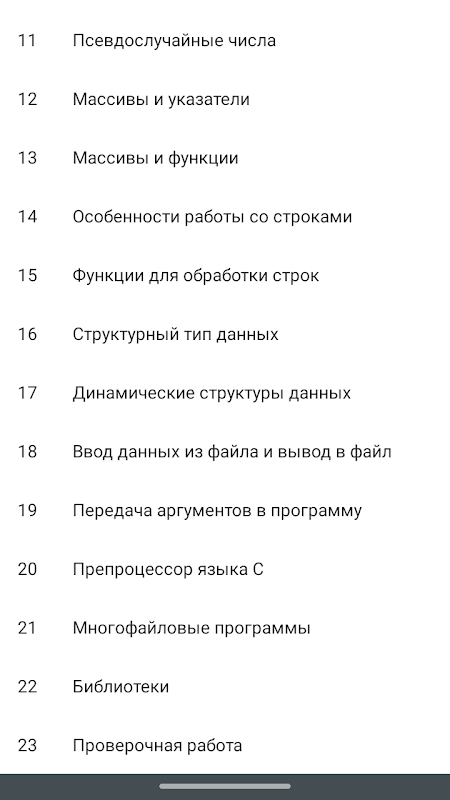 O curso “Fundamentos da linguagem C” inclui 22 aulas e um teste final. O aplicativo está apenas em russo.