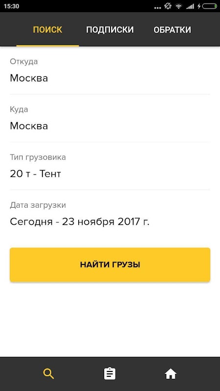 В приложении доступны загрузки для машин от 1 до 20 тонн с типами кузова тент, реф, изотерм и др.