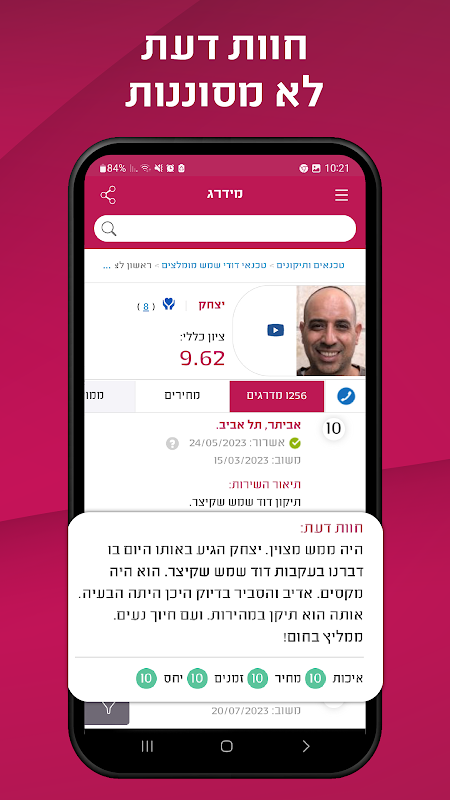 באפליקציה תוכלו לקרוא חוות דעת מפורטוש בעל מקצוע בכל אחד מהפרמטרים: איכות, מחיר, זמנים, יחס אישי וציון.