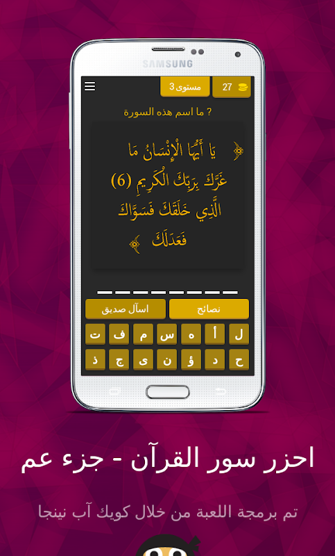 احزر سور القرآن - جزء عم لعبة رمضانية مسلية تمكنك من مراجعة جزء عم بطريقة لعبة أسئلة رائعة ومميزة بدون إنترنت.