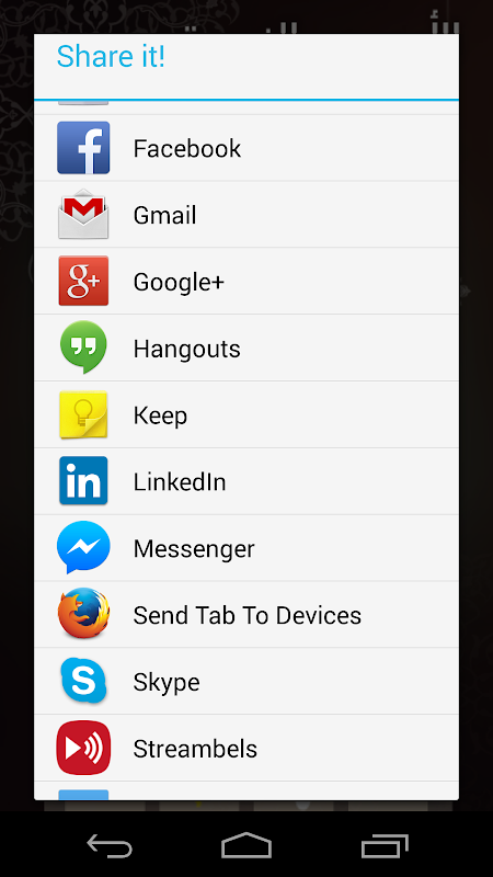 - إمكانية مشاركة الأحاديث مع الأصدقاء على فيسبوك ،تويتر أو أي برنامج أخر للإرسال ، او إرسالها عن طريق الرسائل القصيرة او الإيميل