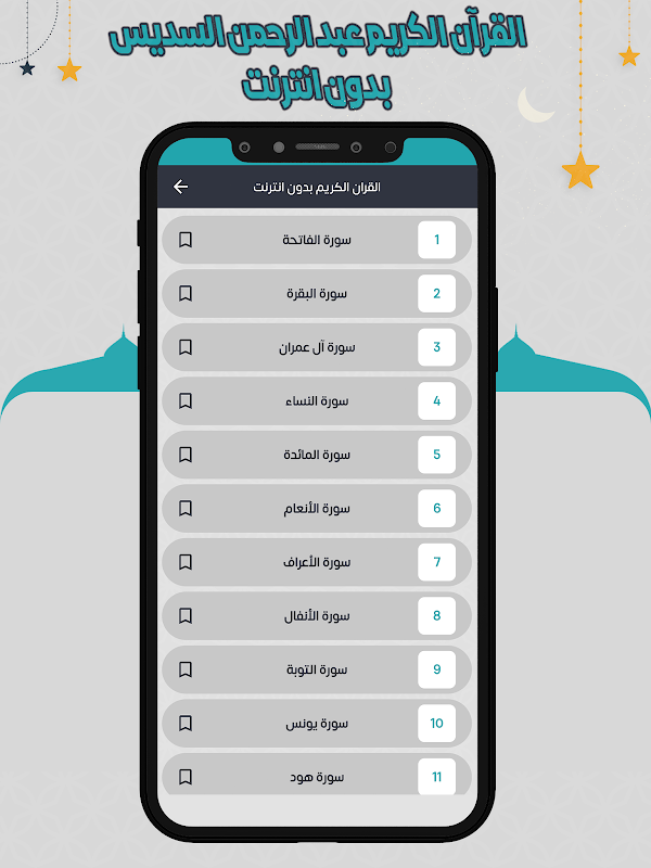 O aplicativo Holy Quran com a voz de Abdul Rahman Al-Sudais permite que você ouça todas as suratas do Nobre Alcorão por meio de seu telefone celular ou tablet com facilidade por meio de um programa que contém todas as suratas do Sagrado Alcorão. A loja para telefones Android. O aplicativo Holy Quran pode ser baixado com a voz de Abdul Rahman Al Sudais com facilidade, para que você possa desfrutar da recitação do Holy Quran com a voz do Sheikh Abdul Rahman Al Sudais onde quiser.
