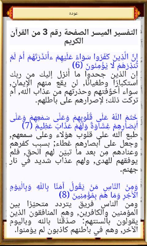 Este Alcorão inclui muitas vantagens, a mais importante das quais é que contém Al-Tafsir Al-Tafsir e Tafsir Al-Jalalin para cada página. E para tornar a leitura mais fácil para todas as categorias, este Alcorão contém ampliação da fonte ao girar o telefone ou tablet e também possui o recurso de leitura no modo noturno. O aplicativo também contém subaplicativos para encontrar tudo o que você precisa. O aplicativo contém uma fortaleza muçulmana completa e um contador de louvor e dhikr.