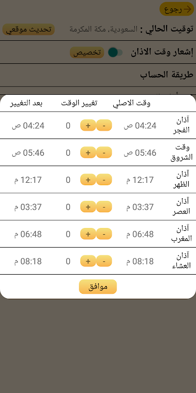 - Ajuste as configurações da chamada à oração de acordo com a seita e jurisprudência disponível no aplicativo