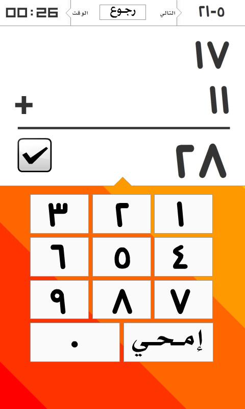 المستوي السهل : اللعبة تقترح عليك عمليات الجمع و الطرح لمدة 30 ثانية