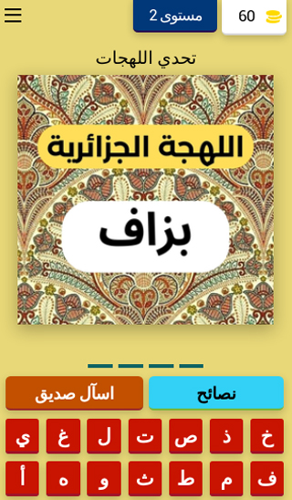 Dialect Challenge Game é um jogo que testa sua compreensão e compreensão de mais de 15 dialetos árabes diferentes e, embora seja um jogo divertido, ajuda o jogador a aprender sobre diferentes dialetos árabes e ajuda a entender o dialeto de seus amigos de diferentes árabes países, e os dialetos dentro do jogo variam para 15 dialetos, e os dialetos árabes são Arábia Saudita, Emirados, Kuwait, Omã, Bahrein, Egito, Marrocos, Iêmen, Iraque, Argélia, juntamente com muitos outros dialetos.