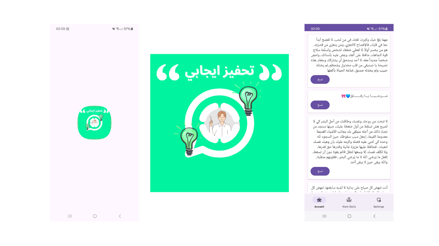 O aplicativo "Minha Motivação Positiva" é seu companheiro diário para gerenciar sua saúde mental e aprimorar seu bem-estar interior. Ele foi cuidadosamente projetado para proporcionar uma experiência única que combina monitoramento de humor, citações motivacionais em árabe e exercícios respiratórios para ajudar você a relaxar e alcançar o equilíbrio.