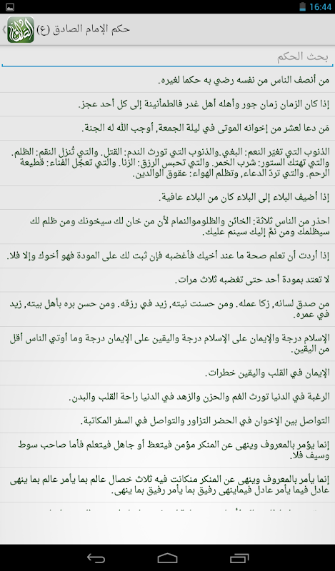 مجموعة من الحكم المُجمعة للإمام الصادق (ع) في مواضيع مختلفة في تطبيق واحد فريد.