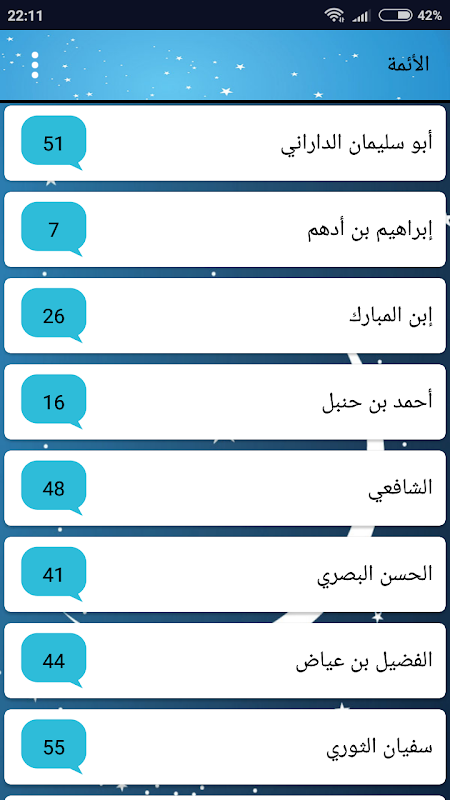 O aplicativo exibe mais de quinhentos transferências de predecessor imãs sênior (Abu Suleiman Aldarani, Ibrahim ibn Adham, Filho do Deus Bendito, Ahmad ibn Hanbal, Shafi'i, Hasan al-Basri, Fadhil bin Ayaz, Revolucionária Sufian, Abdullah bin Masood, Ali bin Abi Talib, Omar bin discurso, Omar bin Abdul Aziz, Malik bin Dinar, Yahya bin livre).