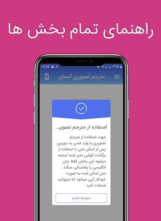 🔰قابلیت فوق العاده ocr : تشخیص جملات انگلیسی از روی متون نوشته شده ی روی کاغذ یا هر چیز دیگری.دوربین خودتونو روی متن قرار بدید تا به صورت خودکار متن روی کاغذ وارد برنامه بشه و بعد اون رو ترجمه کنید.(فقط متون انگلیسی)