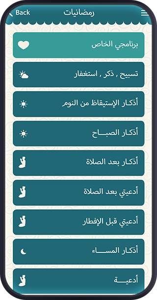 Ele contém uma seção do Alcorão, dhikr e súplicas, e sua glorificação abrangente de todos os tipos de dhikr, glorificação, Ramadã e ruqyah legalmente. O aplicativo apresenta seções que permitem adicionar suas próprias lembranças e súplicas e mantê-las dentro do inscrição