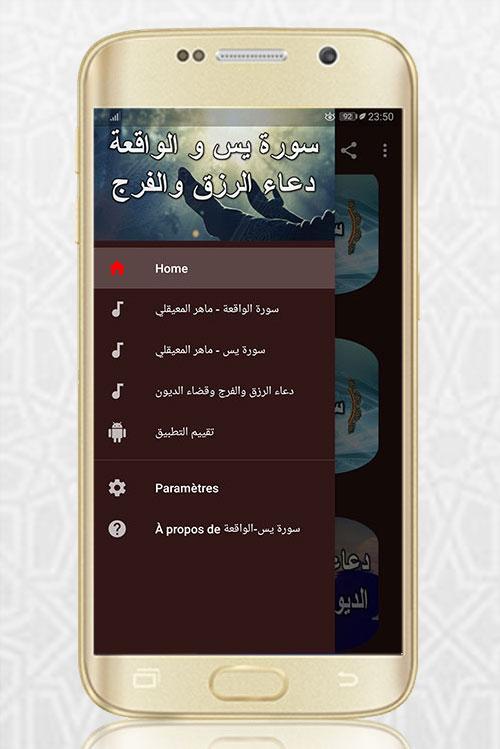 O aplicativo contém Surat Yassin, Al-Waqi'ah, Dua Al-Rizk e Al-Faraj com a voz de Maher Al-Moaqli sem Net
