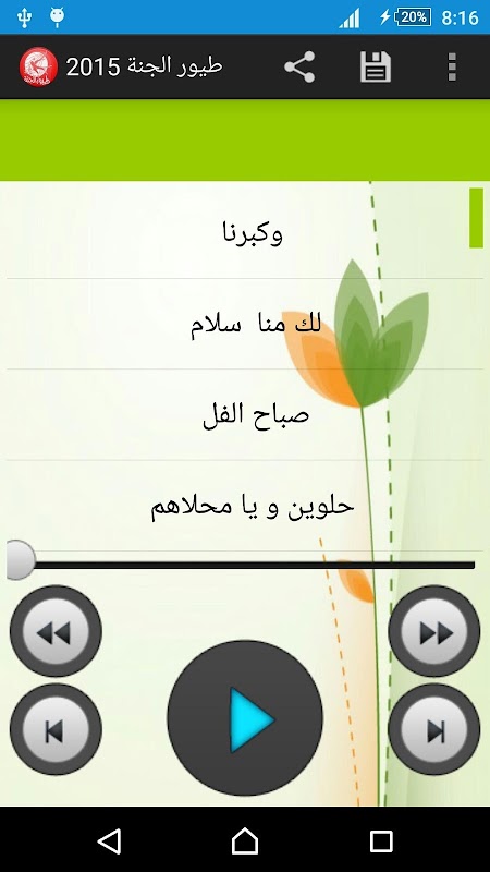 قناة طيور الجنة بدون انترنت كاملة تطبيق يعرض احدث و اجدد اغاني طيور الجنة بدون نت 2017 و 2016 و اجمل اناشيد الاطفال اغاني طيور الجنة بيبي اغنية ماما جابت بيبي بدون نت و كذلك مجموعة كبيرة من جميع اغاني امينة كرم 2017 مثل وكبرنا و لك منا سلام و اغاني وقصص طيور الجنة بيبي بدون نت وبدون فيديو فقط الاستماع و و كذلك اغاني جنى مقداد اجدد و احدث اناشيد جنى مقداد بدون انترنت مثل المرجودة و ثياب المدرسة و نعيما و العديد من الاناشيد الجميلة اغاني اطفال كذلك يمكن حفظ الانشودة علي جوال اغاني جنى مقداد و كذلك امكانية مشاركة اغنية ماما جابت بيبي وغيرها بين الاصدقاء والاحباب طيور الجنه بدون انترنت فيديو اتمني ان ينال اعجابكم ونسعد باقتراحاتكم اغاني طيور الجنة