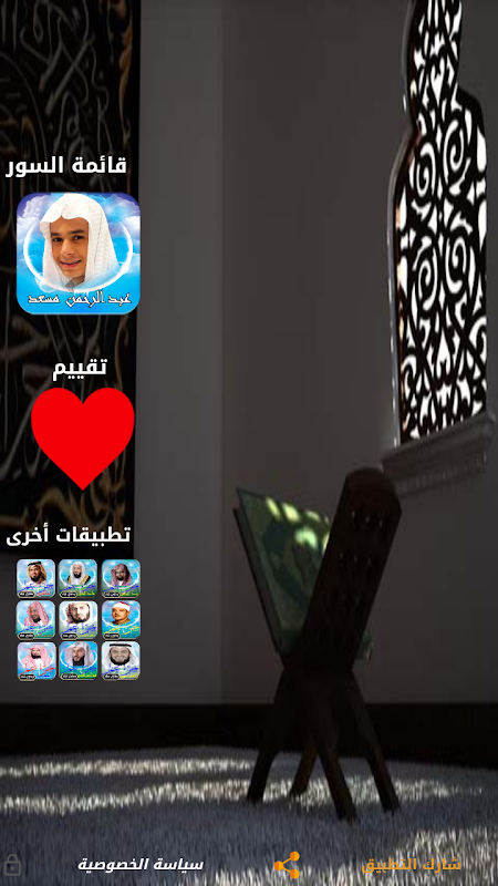 مرحبا بكم في تطبيق القران الكريم عبد الرحمن مسعد بدون نت. يمكنكم تطبيق تطبيق القران الكريم عبد الرحمن مسعد من الإستماع إلى القران الكريم بصوت عبد الرحمن مسعد بدون نت بجودة ممتازة، بالاضافة الى أن تطبيق تلاوة القرآن بصوت عبد الرحمن مسعد مجاني ويمكن تحميل تطبيق القرآن الكريم بصوت عبد الرحمن مسعد بكل سهولة لكي تستمتع بتلاوة القرآن الكريم بصوت الشيخ عبد الرحمن مسعد أينما تشاء وفي اي وقت تريد وايضا قمنا بتصميم برنامج القران الكريم عبد الرحمن مسعد بدون نت ليكون سهل الاستخدام بواجهة بسيطة جذابة وسلسلة وسهلة الاستعمال.