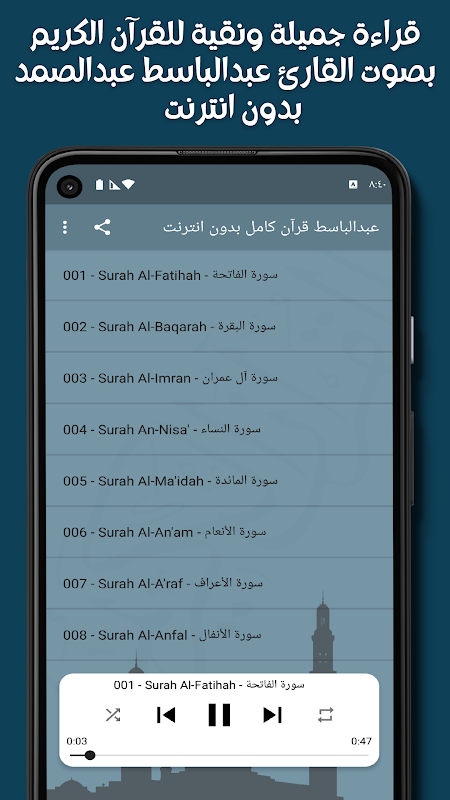 Agora você pode usar o aplicativo com facilidade e ouvir as suratas do Nobre Alcorão com a voz do Sheikh Abdul Basit Abdul Samad e viver um maravilhoso caso de fé no qual você mergulha nos significados do Nobre Alcorão, desfrutando a voz do Sheikh Abdul Basit Abdul Samad, que o transporta para outro mundo com sua voz distinta.