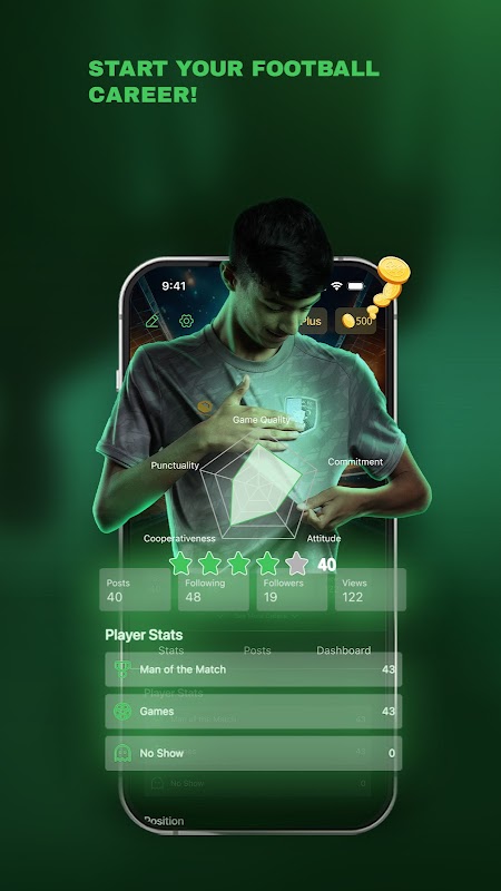 Complete o seu perfil, carregue o seu vídeo de habilidades e compartilhe seus números, há olheiros em nossa plataforma que fazem testes a todo momento que podem ajudá-lo a chegar a um clube profissional e começar sua jornada no futebol!
