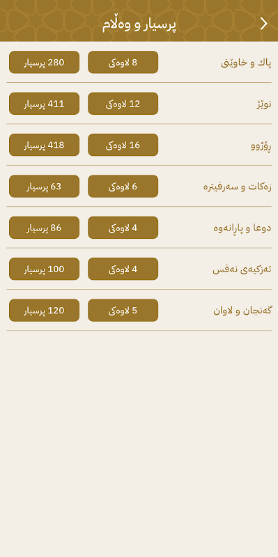 ناوهڕۆكی دوعاكان له كتێبی (ئایه لهم دهرگایهت داوه) وهرگیراوه, له كاتهكانی بانگدا دهتوانیت كاتی بانگی ههر ڕۆژێكی ساڵت بوێت بیزانیت, بابه تهكان له ماڵپهڕی بهههشتهوه وهرگیراوه، پرسیار وهڵامهكان له مهڵامهكان له اڵپهڕی (وهڵامهكان) هوه وهردهگیرێت بهردهوام نوێ دهبێتهوه پێ پر سیار e وهڵامهكان بهردهسته لهم ئهپه ئهگهرویستیشت تهواوی پرسیار و و هڵامهكان بهدهست بهێنیت دهتوانێت ئهپی (وهڵامهكان) دابهزێنیت كه له ههردوو ستۆری appstore , playstore بهدهسته، زیكرهكان له قهلای مسوڵمانهوه ه دهنگهكان دابگ یته ناو ئامێرهكهت بهڵكو بهشێوازی online گوێبیست دهبیت و قهبارهیهكی كهم له باندی ئینتهرنێتهكهت دهبات, بهشی پهیا مهكان پێك دێت له ههندێك فهرمووده e وتهی سودبهخش كه بهردهوام ن ێ دهبێتهوه.