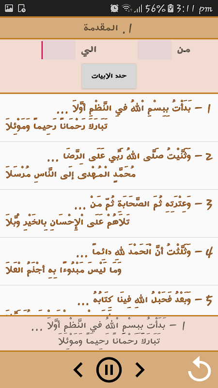 A seção de versículos do quadro Shatby permite repetir cada casa ou especificar mais de uma casa e repeti-la