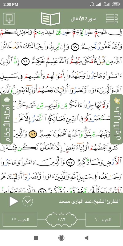 A aplicação apresenta-lhe exemplos práticos do Alcorão às disposições da entoação na cor.