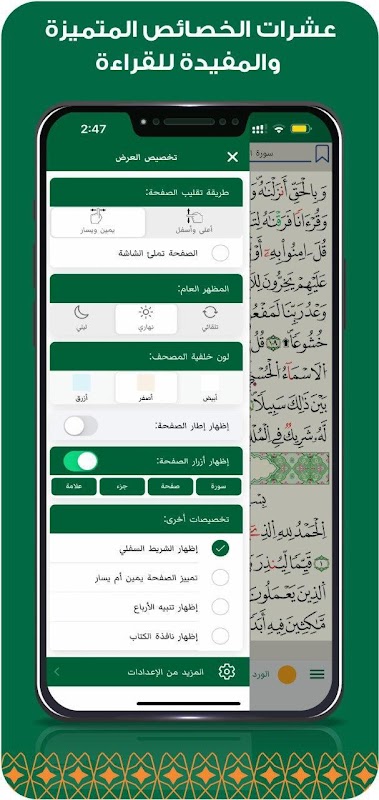 O aplicativo proporciona uma experiência única ao leitor por meio de dezenas de recursos distintos e úteis, pois contém diversas opções educacionais úteis para recitação nas vozes de mais de um leitor. Também reúne os livros e interpretações mais famosos com a possibilidade de navegar sem Internet. Além disso, o aplicativo oferece a capacidade de exibir duas páginas, exibição ampliada e leitura noturna. E muitas outras características distintivas.