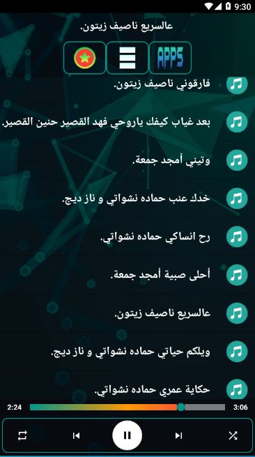 O aplicativo de várias músicas sírias é um aplicativo gratuito para Android que inclui várias músicas dos artistas sírios Nassif Zaytoun, Amjad Jumaa, Fahd Al-Qaseer, Hamada Nashawati e Rabih Al-Omari. Oferecemos ao ouvinte o serviço de ouvir músicas sem a necessidade para estar conectado à Internet. Aqui está o conteúdo do aplicativo: