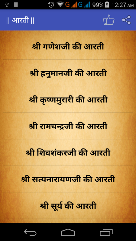 Application content Aarti, Stotra, Mantra, Chalisa, Ashtakam for all Gods and Goddess. like Ganesh, Shiva, Rama, Hanuman, Vishanu, Laxmi, Gayatri, Saraswati, Laxmi, Kalika, Surya, Shani, Narsivha, Dattatray, Durga etc.