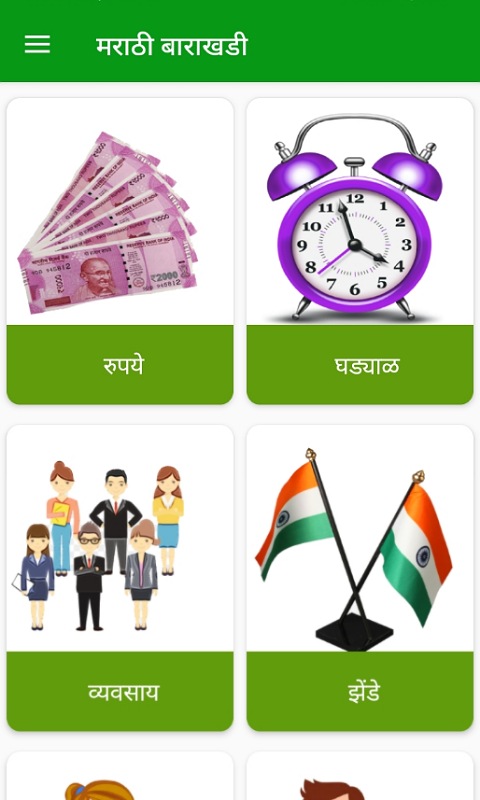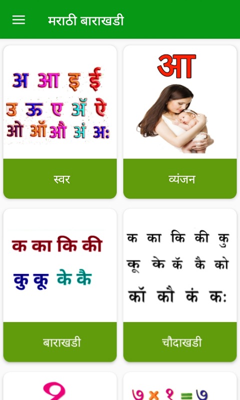 O aplicativo Marathi Barakhadi consiste nas seguintes categorias: