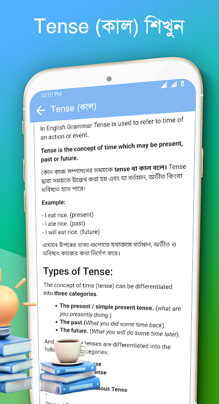 O aplicativo de livro de gramática apresenta lições interativas que cobrem todos os aspectos da gramática inglesa, incluindo tempos verbais, estrutura de frases e pontuação. As aulas são apresentadas em linguagem Bangla fácil de entender, o que a torna acessível para falantes de todos os níveis.