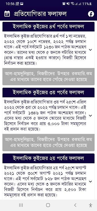 আমি আশা করি অ্যাপসটি আপনাদের উপকারে আসবে এবং এটির মাধ্যমে আপনারা অনেক কিছু শিখতে ও জানতে পারবেন। আমার এই ইসলামিক কুইজ প্রতিযোগিতা প্রতি ২ মাস পর পর আয়োজন করা হয়ে থাকে এবং ইসলামিক কুইজে অংশগ্রহনকারী বিজয়ীদের পুরষ্কার রকমারি ডট কমের মাধ্যমে তাদের প্রছন্দ অনুযায়ী তাদের দেওয়া ঠিকানায় পাঠিয়ে দেওয়া হয়। ইসলামিক কুইজে আপনাকে সর্বমোট ৫০ টি বহু-নির্বাচনী প্রশ্নের সম্মুখীন হতে হবে, যেখানে প্রতিটি প্রশ্নের জন্য ৪টি অপশন থাকবে এবং আপনাকে যেকোনো একটি অপশন নির্বাচন করতে হবে। এছাড়া প্রতিটি প্রশ্নে আপনার জন্য বরাদ্ধ থাকবে শুধুমাত্র ৩০ সেকেন্ড সময় এবং এর মধ্যেই আপনাকে সঠিক অপশনটি নির্বাচন করতে হবে।