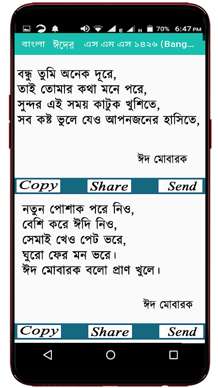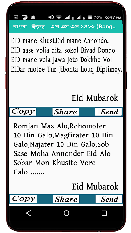 সামনে আসছে ঈদ - eid তাই আমরা আপনাদের জন্য নিয়ে এলাম ঈদের শুভেচ্ছা মেসেজ। ঈদে আপন জনদের ঈদ মোবারক শুভেচ্ছা এস এম এস পাঠাতে হয় আর এসএমএস পাঠাতে হলে প্রয়োজন হয় সুন্দর ছন্দ মেলানো ঈদের শুভেচ্ছার মেসেজ কিন্তুু অনেকেই পারেন না মেসেজ সিজিয়ে লিখতে তাদের জন্য আমাদের এই অ্যাপটিতে থাকছে বেশ কিছু eid sms যেটা ভালো লাগে কপি বা সেন্ড অপশনে ক্লিক করে আপন জনদের কে পাঠিয়ে দিন।
