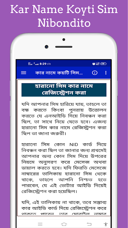 É verdade que os telefones celulares são atualmente o meio de comunicação mais popular. Portanto, a popularidade dos telefones celulares está aumentando dia a dia. No entanto, o cartão SIM mais necessário para executar o celular. O celular é inútil sem este cartão SIM. Portanto, o registro do SIM será necessário para o cartão SIM. 20 SIMs podem ser registrados com um cartão NID ou cartão de identificação de eleitor. Como uma pessoa pode registrar 20 SIMs, às vezes não se lembra quais SIMs estão registrados em seu nome ou em nome de outra pessoa. Então aqui está uma maneira de você saber quantos SIMs estão registrados em seu nome ou quantos SIMs estão registrados em seu nome. Apner Name Koiti Sim Nibondito Janar Upai ou Biometric SIM Verifier é um aplicativo completo. Quantos SIMs podem ser registrados no nome do carro e quantos SIMs podem ser registrados com seu cartão NID, etc. Com o aplicativo, você pode saber facilmente sobre o registro de SIM de diferentes operadoras.