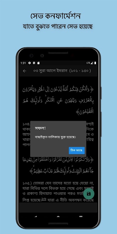 কুরআন পড়ার সহজ অ্যাপ, বাংলা- আরবি, সেভ করে রাখা যাবে, শেষ পাঠ অটো সেভ থাকবে