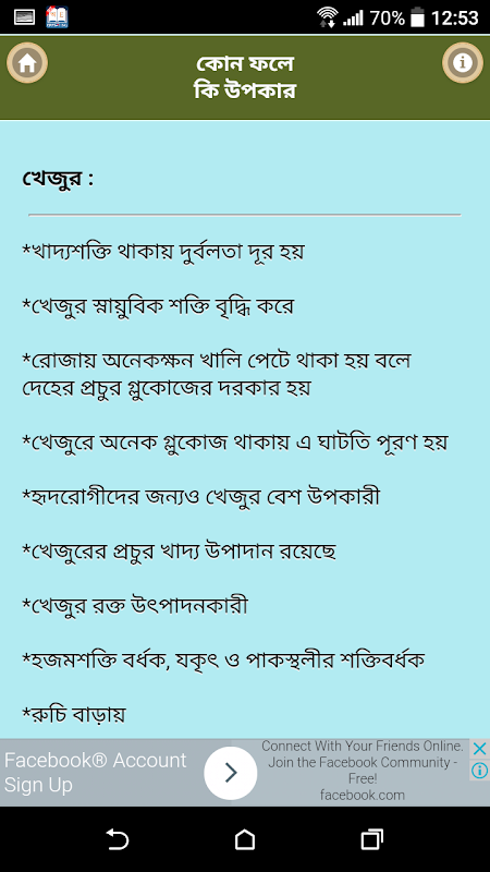 ফল আল্লাহ তায়ালার এক অশেষ নিয়ামত। পৃথিবীতে মহান রাব্বুল আলামিন আমাদের জন্য অনেক ফল্মুল পাঠিয়েছেন। এবং প্রত্যেক ফলে রয়েছে আলাদা আলাদা গুনাগুন। যা আমাদের মানব দেহের জন্য বিভিন্ন ভাবে উপকার করে থাকে। তাই আমাদের প্রত্যেকের জানা দরকার কোন ফলে কি পুষ্টিগুণ রয়েছে। যাতে করে আমরা ইচ্ছা অনুযায়ী বুঝে শুনে প্রয়োজনীয় ফল্মুল খেতে পারি। আশা করি আমাদের এই এপস টি আপনাদের কাজে দিবে।