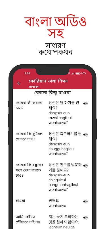 অডিওসহ এই অ্যাপে সহজে শিখুন কোরিয়ান ভাষা। বর্ণমালা, শব্দভাণ্ডার এবং বাক্য গঠন।