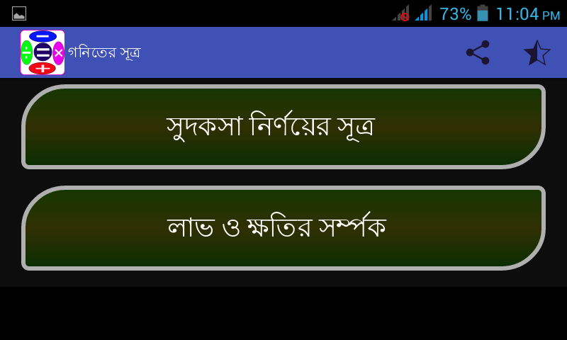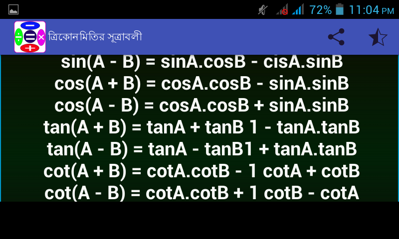 গনিত সবার কাছেই খুব কঠিন মনে হয়. কিন্তু গনিতের সূত্রাবলী জানা থাকলে গণিতের মজা আপনি নিজেই বুঝতে পারবেন. এমনই কিছু বীজ গনিতের সুত্র, পাটি গণিতের সূত্র ও জ্যামিতির সুত্র দিয়ে সাজানো আমাদের অ্যাপলিকেশন টি. অ্যাপলিকেশন টিতে আরও পাবেন