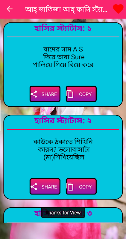 এই অ্যাপসটিতে যে সব হাসির জোকস স্ট্যাটাস আছে তা অপনি বন্দুদের সাথে ১ কিল্কে কপি এবং শেয়ার করতে পারবেন ।