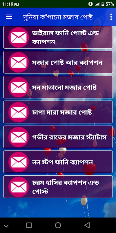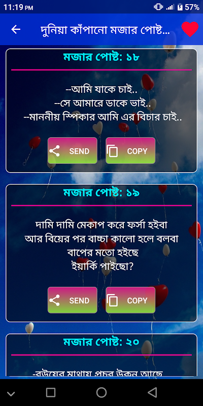 দুনিয়া কাঁপানো মজার পোষ্ট অ্যাপসটি আপনাদের দিবে নতুন হাসির পোষ্ট আর ক্যাপশন । এই বারের থাকছে ফানি পোস্ট, এস.এম.এস, স্ট্যাটাস এন্ড ক্যাপশন নিয়ে আমাদের এই অ্যাপস। এই অ্যাপসটিতে যে সব মজার পোষ্ট আর ক্যাপশন আছে তা আপনি আপনার বন্ধদের সাথে ১ কিল্কে কপি এবং শেয়ার করতে পারবেন ।