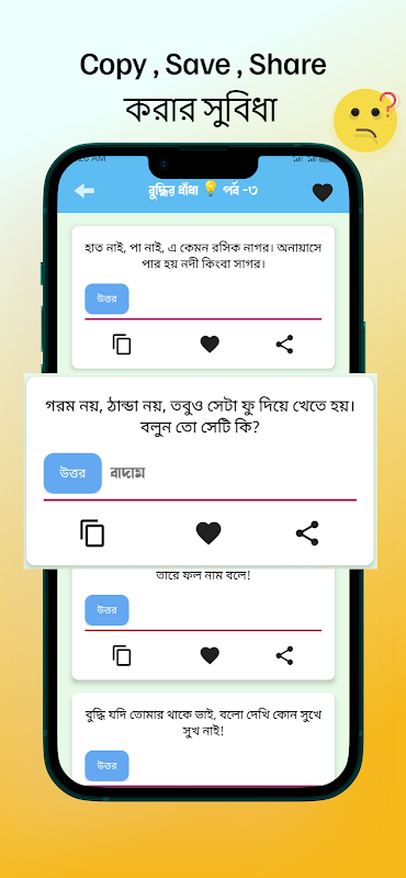 এই অ্যাপে আমরা সেই প্রাচীন ঐতিহ্যের গ্রাম বাংলার মজার বাংলা ধাঁধা ও আধুনিক নতুন ধাঁধাগুলো একত্রিত করেছি শুধুমাত্র আপনার জন্য, যেন আপনি ধাঁধার অভিজ্ঞতা পান।