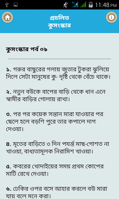 প্রযুক্তি এবং সভ্যতার বিকাশ ঘটলেও আমাদের সমাজ বাবস্থায় এখনও রয়েগিয়েছে নানা রকম কুসংস্কার। আমাদের সমাজে নানা রকম প্রচলিত কুসঙ্গাস কুসংস্কার থাকার কারনে মানুষ এখনও অন্ধকারেই রয়েগিয়েছে। আজকে আমাদের এই প্রচলিত কুসংস্কার দূর করার জন্য এই অ্যাপ টি তিরী করা হয়েছে যাতে আপনারা কুসংস্কার থেকে দূরে থাকতে পারেন। আমরা এখানে সকল প্রকার সামাজিক এবং অসামাজিক কুসংস্কারগুলোকে নিদ্ধারিত করে দিয়েছি যাতে আপনি খুব সহজেই সচেতন হতে পারেন।