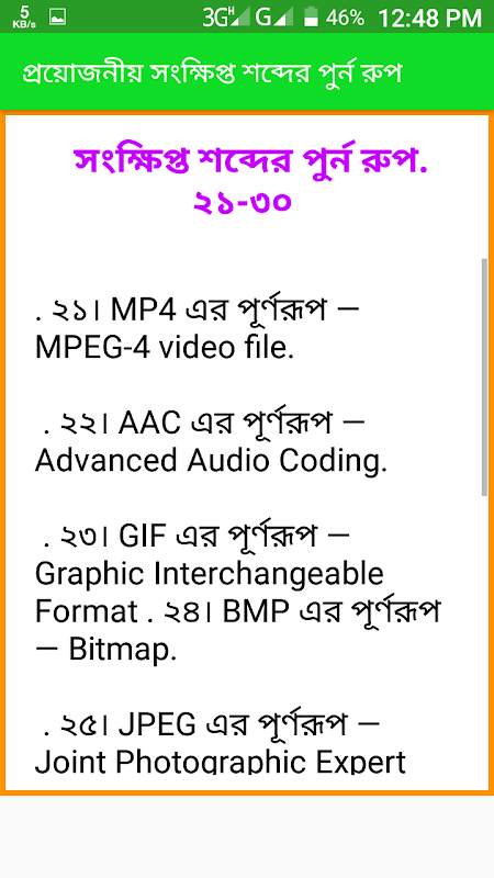 প্রয়োজনীয় সংক্ষিপ্ত শব্দের পুর্নরুপ এই অ্যাপটিতে পাবেনঃ