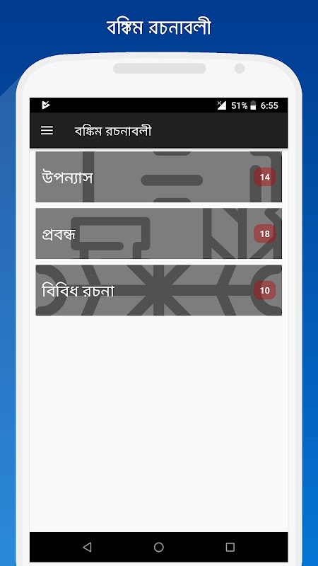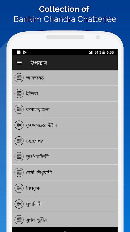 Bankim Chandra Chatrapaddhay or Bankim Chandra Chatterjee is the famous novelist in bangali.If some of our favourit short story,novel written by Bankim Chandra are always in our hand and you can have this whenever you want,how it feels?In our app we tried to collect all short story,novel,life history of Bankim Chandra and hope that you all will also like this.