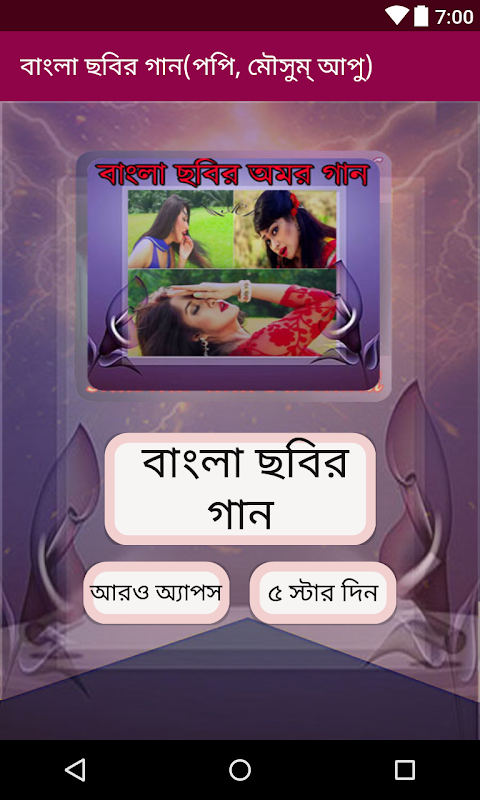 The app is the collection Best of পপি, মৌসুম্ ,আপু Bangla Movie Songs. You can enjoy the most popular Bangla Hot songs. There is also a new Bengali movie songs.All Are Awesome Here. So you can enjoy this apps.