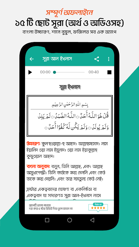 3. 15 suratas curtas com pronúncia, tradução e áudio que podem ser reproduzidas totalmente offline para facilitar a memorização dos usuários.