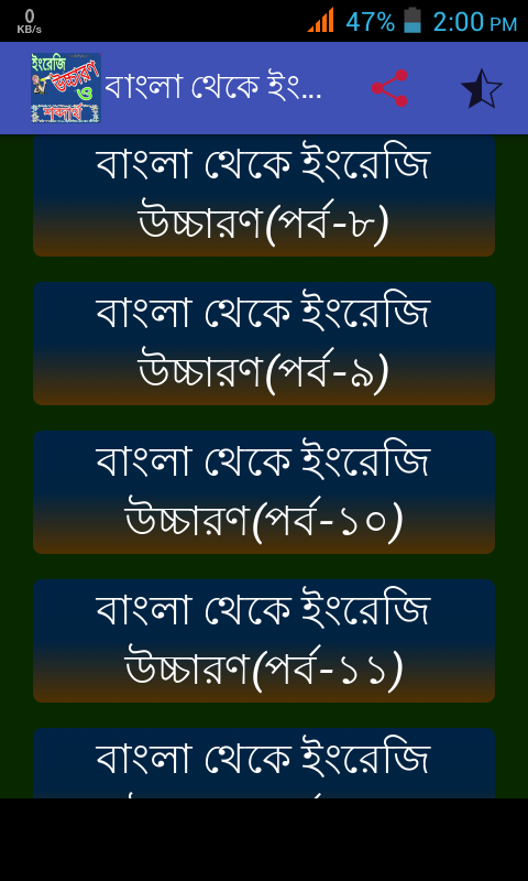 ইংরেজি tradução দেখে খুব সহজেই ইংরেজি উচ্চারন করতে পারবেন.বাংলা থেকে ইংরেজি অনুবাদ ঘরে বসেই শিখতে পারবেন.অনেকে 30 দিনে ইংরেজি শেখার কোর্স করে. আসলে এগুলো করতে হলে ইংরেজি গ্রামার ভালো ভাবে জানতে হবে তাহলেই আপনি bangla à tradução Inglês করতে পারবেন.ইংরেজি থেকে বাংলা অনুবাদ করতে 30 dias aprender a Inglês না শিখে Inglês gramática টা ভালো ভাবে গনিতের সুত্রের মত শিখে নিন তাহলেই দেখবেন Inglês para tradução bangla করাটা আপনার কাছে অনেক সহজ হয়ে যাবে.আমাদের ইংরেজি শেখার কৌশলটিতে আপনাদের জন্য palavra Inglês শেখার যাদু করি কিছু টিপস দেওয়া আছে.যা ধারা সহজেই ইংরেজি শব্দার্থ বা ইংরেজি উচ্চারন শি খতে পারবেন.ভালোবাসার গল্পের মত livro Inglês বা história de amor Inglês গুলো আপনার মন ভালো রাখতে সাহায্য করবে. Dia dos namorados sms ,, amor sms agulo ইংরেজিতে হয় তাই ইংরেজি উচ্চারন বা বাংলা অনুবাদ জানা থাকলে amor dicas বা papel da notícia সহ আরও অনেক ইংরেজি মজার গল্প পড়তে পারবেন .... তাই সহজেই ইংরেজি অনুবাদ শিখতে আশাকরি অ্যাপটি আপনাদের অনেক উপকারে আসবে ...