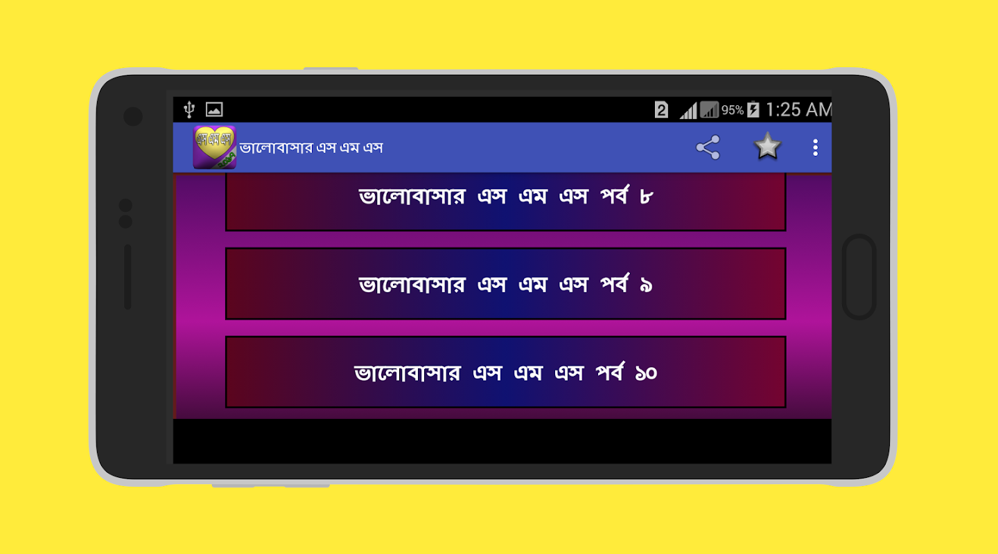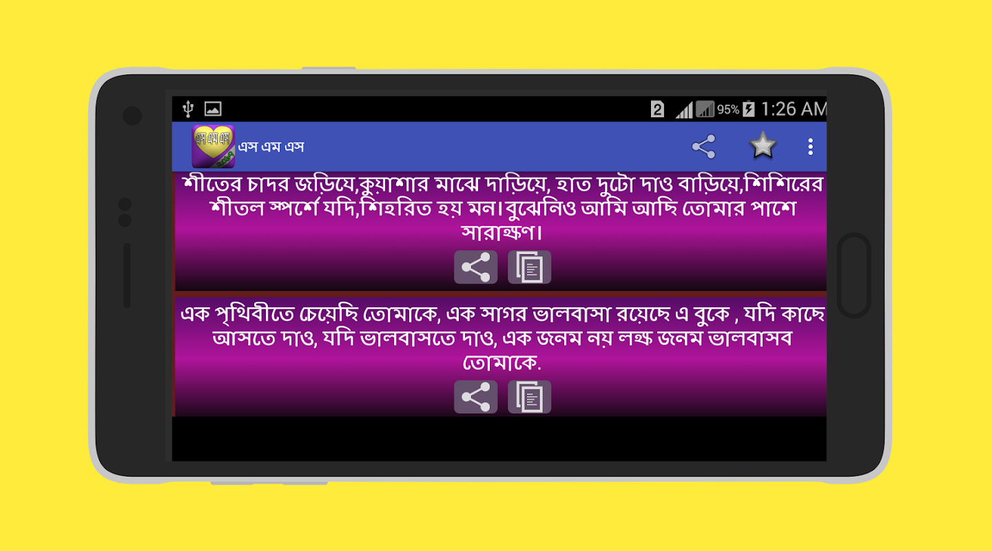 ভালোবাসার মানুষ কে খুশি রাখতে প্রয়োজন হয় কবিতা অথবা এসএমএস আর এই এস এম এস সবাই সাজিয়ে লিখতেও পারেন না। তাহলে কি করবেন? চিন্তা নেই আমরা আপনাদের জন্য নিয়ে এলাম ভালবাসার এস এম এস আপনি শুধু পড়বেন আর যেটা পছন্দ সেটা ক্লিক করে পাঠিয়ে দিবেন আপনার প্রিয় মানুষ কে। এর জন্য আমরা ভালোবাসার মেসেজ অ্যাপ টি তে রেখেছি sms কপি ও সরাসরি সেন্ড করার অপশেন।