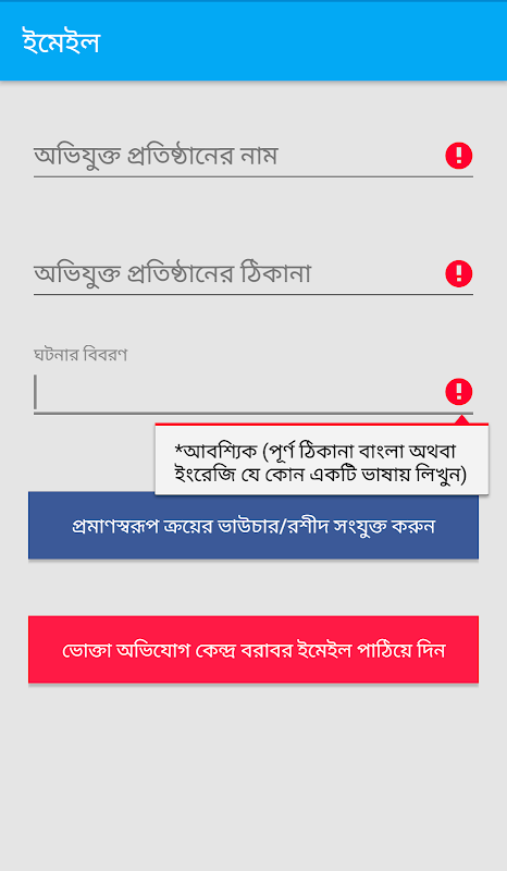 জাতীয় ভোক্তা-অধিকার সংরক্ষণ অধিদপ্তর বরাবর অভিযোগ করুন এবং জরিমানার ২5% অর্থ পান খুব সহজে "ভোক্তা-অধিকার অভিযোগ কেন্দ্র" অ্যাপ ব্যবহার করে. গুগল একাউন্ট ব্যবহার করে অ্যাপটিতে লগিন করুন, এরপর আপনার সাথে যোগাযোগ করার জন্য ফর্মটি পূরণ করুন. এই ফর্মের তথ্যগুলো আবশ্যক অভিযোগ করার জন্য, এই তথ্য অনুসারেই আপনার সাথে জাতীয় ভোক্তা-অধিকার সংরক্ষণ অধিদপ্তর থেকে যোগাযোগ করা হবে. এরপর "অভিযোগ করুন" অপশন বাছাই করে অভিযোগ পেজে যান, সেখান থেকে অভিযুক্ত প্রতিষ্ঠানের নাম, ঠিকানা, ঘটনার পূর্ণ বিবরণ এবং ক্রয়ের রশিদ / ভাউচারের ছবি দিন. আপনাকে একটি ইমেইল ক্লায়েন্ট ওপেন করতে বলা হবে, যেটায় লগিন করা আছে, সেটা সিলেক্ট করুন এবং ইমেইল পাঠিয়ে দিন. আপনার অভিযোগ ভেরিইফিকেশন এর পর আপনার সাথে জাতীয় ভোক্তা-অধিকার সংরক্ষণ অধিদপ্তর থেকে যোগাযোগ করা হবে.
