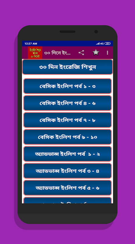 অ্যাপটিতে রয়েছে ইংরেজিতে কথা বলার মোট ১০ টি কোর্স basic and advance. এই কোর্স গুলোতে আপনারা পাবেন ইংরেজি শেখার শহজ কিছু উপায়।