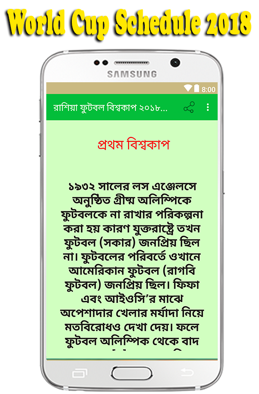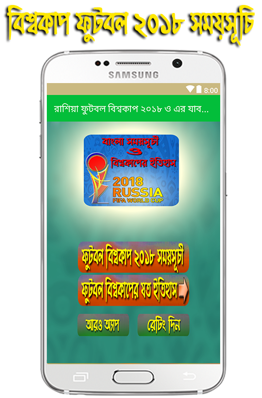 এই অ্যাপের সাহায্যে আপনি বাংলা ফুটবল বিশ্বকাপের সময় সুচি ও ফুটবল বিশ্বকাপের যাবতীয় ইতিহাস জানতে পারবেন ।